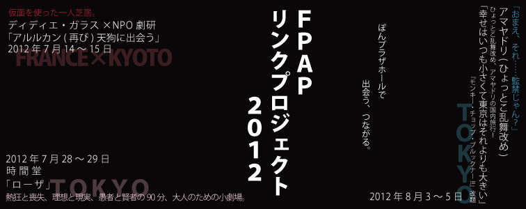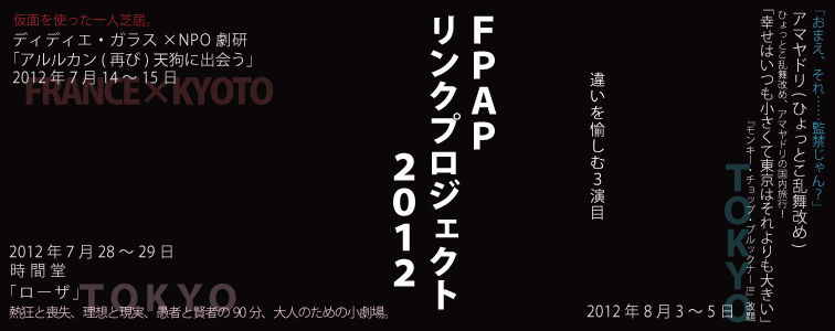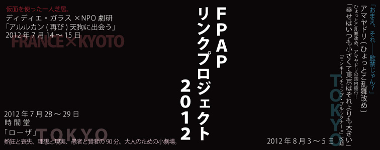 2012年7月14日(土)18:00★ 2012年7月15日(日)15:00 ★14日18:00の回終演後、アフタートーク有 ゲスト:杉山準(プロデューサー) 司会: 三坂恵美(NPO法人FPAP) 内容:NPO劇研との共同製作の話、そしてフランスと日本の演劇環境の違いについて |