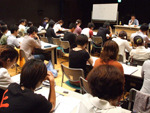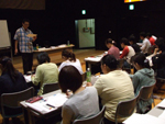 照明編・音響編と違い、舞台監督編はレクチャー中心のワークショップでした。 まずは、「舞台監督やったことある人?」と講師から参加者へ。 自分でやってみてどんな仕事だと思ったか?という問いに、 古賀さん:そうですね。今出た答えも一つの答えです。僕が今日言う事は、今まで僕が諸先輩方に言われてきたこと。舞台監督の仕事は、視覚的に見えない、聴覚に訴えるものでもない。稽古スケジュールを作ることから始まり、演出家がどんな作品をつくろうとしているかを考えている。出演者よりも人望が必要だし、時間を各パートに割り当てるという仕事もあります。 古賀さんは、舞台監督の師匠から言われた「舞台監督は批評の対象にならない」という言葉を大切にしているそうです。 古賀さん:人の一歩先を考える。時間より早くくれば信頼されます。技術も何もなければ、時間を守る、ということをまず心がけましょう。それができれば信用されます。スタッフの一員として人よりも早く来る・時間に遅れないというのが大事です。基本ですが、これがなかなか難しかったりするんですね。 また、「安全のための確認」について、「監督」と名前がついている限り、何か事故があったときには、責任を持たなくてはいけない仕事である、というお話もありました。