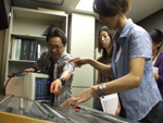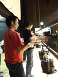 調光卓にパッチをして、フェーダーに1本1本明かりをいれる作業を説明してもらいます。