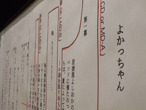 模擬検定に使う台本は照明の時にも使った「よかっちゃん」です。音のきっかけ、キューを確認して遠藤さんによる実演を見てから順番に本番へと突入です。