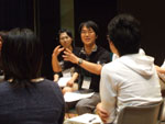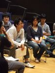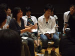 ―自己紹介(事前連絡をしていた内容も含む・着座位置順) ■池江拓哉(イケエタクヤ) 九州大学 [演劇部の人数]22人 ■紺屋勇人(コンヤハヤト) 宮崎大学 【演劇部の人数】50人 ■宮田晃志(ミヤタコウシ) 鹿児島大学 【演劇部の人数】16〜20人 ■丸山由香理(マルヤマユカリ) 久留米大学 【演劇部の人数】12人 ■大瀬満(オオセミツル) 大分大学 【演劇部の人数】25人 ■小山田佳祐(コヤマダケイスケ) 長崎大学 【演劇部の人数】20人 ■司城宏太郎(シジョウコウタロウ) 熊本大学 【演劇部の人数】8人 ―大分大学大瀬さんから、次の公演会場が500人のキャパシティであることと、集客の不安について話がある。普段は100人ちょっとの集客をしているとのこと。 宮田:新聞、テレビ、雑誌、ラジオと、とにかく当たれるものは当たるといった感じ。だが、それによる効果はあまりない。身内客がやはり多い。お父さん、お母さんには絶対売れよと言っている。 司城:ノルマがあって、余った分は買取だぞと言っているけど…。 池江:チラシ折り込みは必ずやる。福岡は地下鉄の構内に貼ってあるおでかけ案内に、ただで載せて貰えるのがある。 大瀬:やはりノルマとか厳しくやらないと売れないですよね。 ―チケットの料金設定はどうしているかという話になり、無料〜1,500円の間で設定されていることがわかる。無料や300円程度のものが多い。 宮田:会場の関係で499円というのをやることがある。500円以上の入場料を取る場合は施設使用料が変わってくるので。 丸山:無料。 ―チケット料金の話の延長で、部費の話になる。月額や年額や初回のみに必要な費用や、公演時の関わり方で変わるというのもあり、様々。チケットノルマ制をここに加えているところもある。部費を取る必要はないが、責任を感じさせるために幾分徴収しているというような話もある。広告やイベントの手伝いをしながら、足りない部費を埋めているところもあり。 池江:九州大学は公演ごとにキャストいくら、スタッフいくらというように部費を払うようにしている。払いたくないときはその公演をパスすることも可能。 ―交通の便の悪いところにある大学が多いが、公演をする時にどういう基準で会場を選ぶかという話になる。 紺屋:大学生が来やすいように山の中の大学に近いホールを借りている。 宮田:新入生歓迎公演など、学生を対象としたものは大学でやるが、普段は一般のお客さんに観てもらうため、学外に出ている。 丸山:大学事務局が年に一度、石橋文化センターというホールを借りているので、夏はそこで公演をすることになっている。 小山田:長崎は路面電車を使えば120円でどこまででもいけるから、あまり気にしない。 池江:九州大学は山の中に移ってしまい、その中には演劇公演できる会場がない。だから外でやっている。 ―演劇部内のモチベーションの差を問題視しているという声が幾つかある。まずは出席者の演劇をやっている動機について確認し、話をすすめることとなった。 池江:やるきっかけになったのは、スピットライトを浴びて、人に注目されて気持ちがいいというところからスタートしていると思う。 紺屋:部員が50人もいるから、それぞれいろんな理由があるとは思う。おいしいご飯食べられるからとか、誘われたからとか、どこで楽しさを見出すかわからないけど。 大串(福岡大学):「モチベーションの差」というので問題になっているのは、2つの考え方の違いだと思う。うちでは「サークル性」と「特殊性」と呼んでいる。「サークル性」とは、わいわい楽しみたい、仲間と一緒にいたいというもので、一方「特殊性」というのは、いいものを作りたい、作品のクオリティを上げたいというもの。この両者はいつもぶつかり、どちらかが辞めるということになる。 紺屋:確かにそれはある。自分たちでもその葛藤はあり、結局「人がやめないようにしよう」という方針とした。特殊性を求める場合は、大学ではなくて劇団でもいいと思う。大学の名前がついたサークルで、ちょっと演劇に興味を持った人に嫌な気持ちにさせるのは、表現は大げさだが演劇界にとって勿体無いことだと思う。部員がやめないぎりぎりのところで特殊性を高めたいと思っている。 大串:そう、サークル性を高めると、特殊性の人が離れていく。 紺屋:サークル性の人は辞めやすいというのはある。 司城:まさにうちがそれ。特殊性を高めようとした。部員が8人になってしまった。 宮田:かつて鹿児島は特殊性を極めようとした人たちが劇団を作って出ていった。その劇団が部員を取り込んで、部活が一度衰退した時期があった。 丸山:この視点で公演をする度に喧嘩が起こってて、それを見て嫌だなと思っていた。せっかくサークルに入って劇をするというのに、毎回毎回喧嘩して辞めちゃうっていうのは、違うと思った。個人には、サークル性のほうの意見も重視している。 紺屋:「サークル性」と「特殊性」と二項対立みたいに見ずに、それぞれの良さにつ